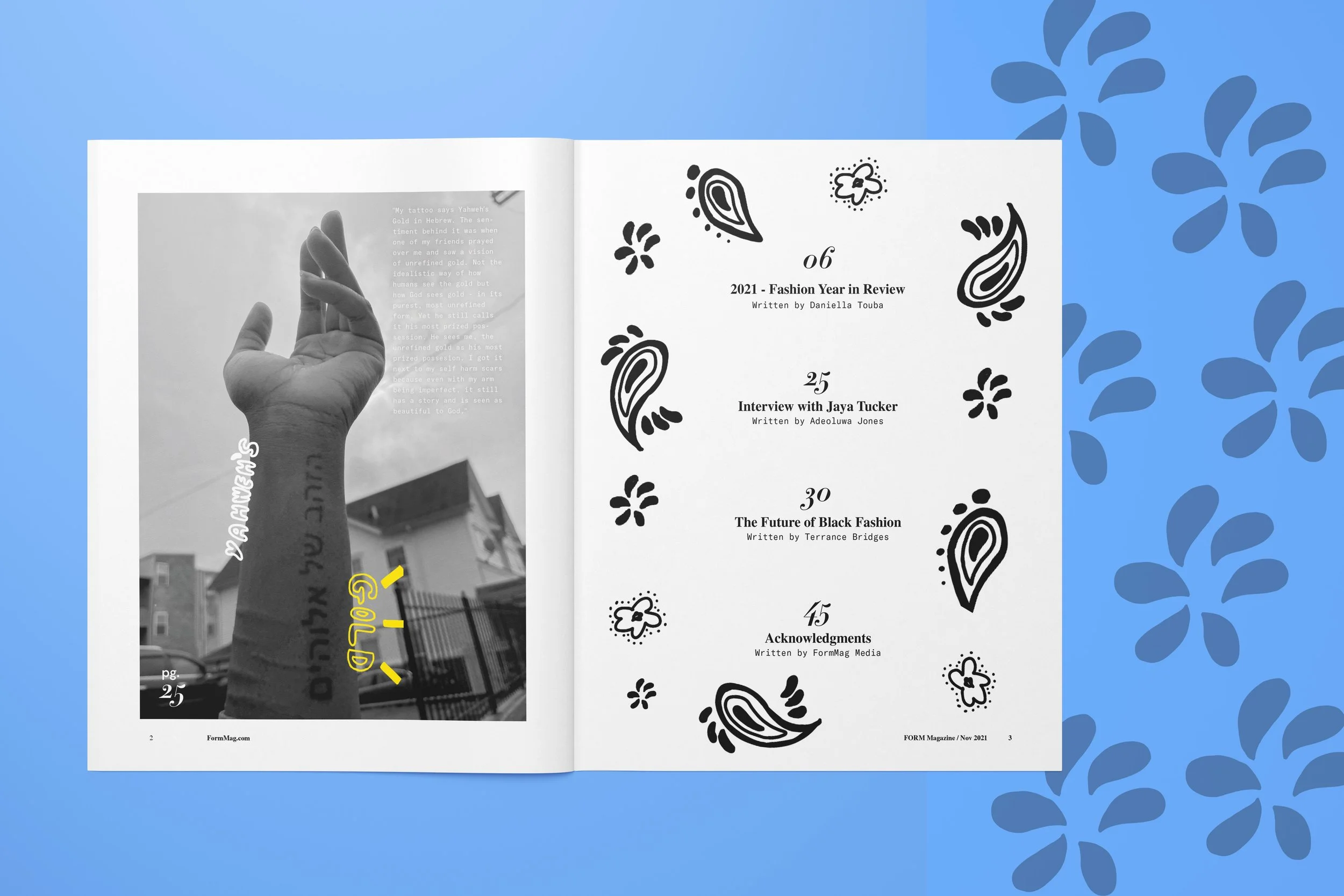 Design-wise, I wanted to create a universe in which both the type and illustrations played off of who Jaya was as a person, all while also creating a cohesive and functional aesthetic for the magazine to follow.